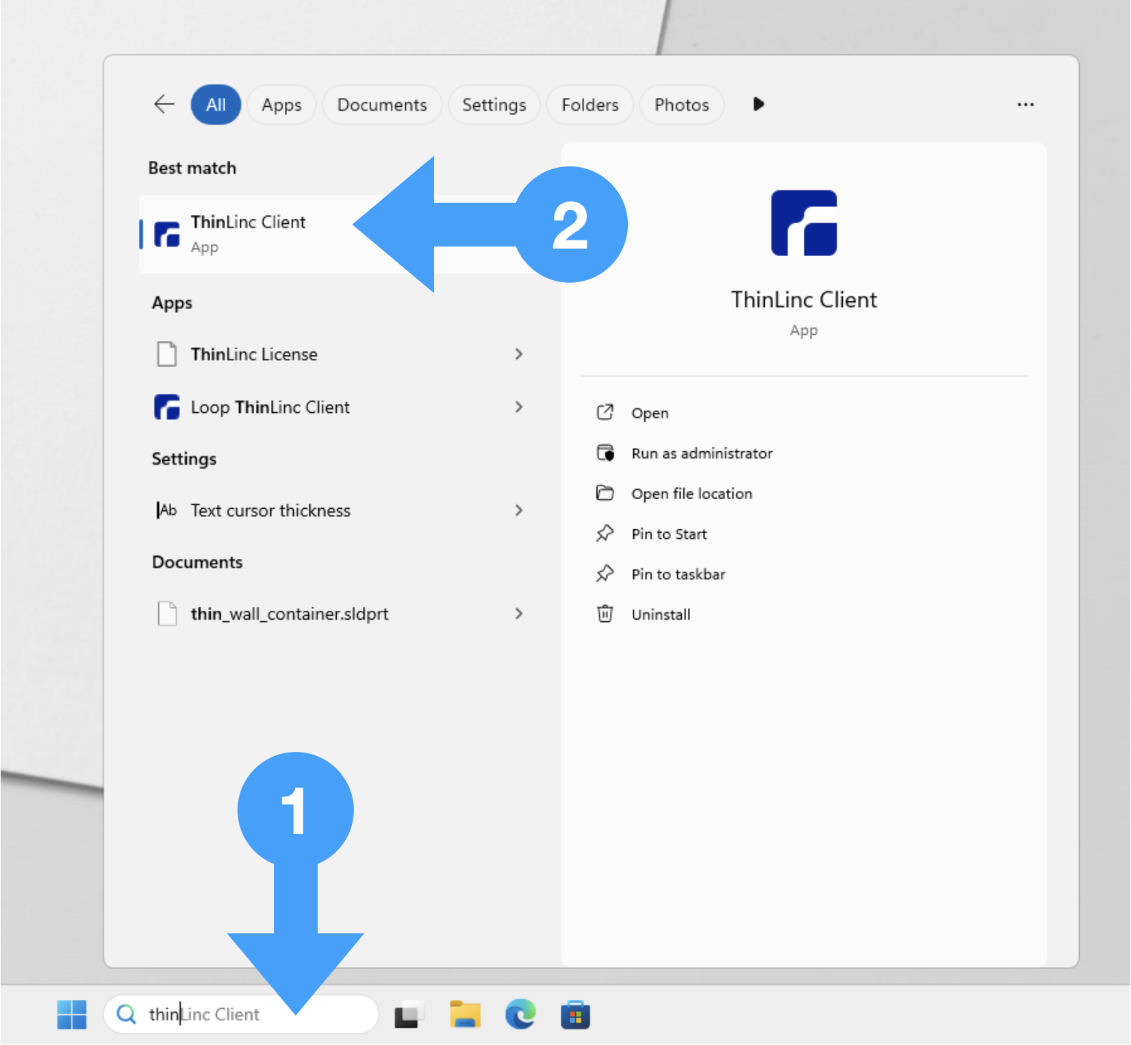 I Aktivitetsfältet hittar du en sökruta. Skriv in ThinLinc i sökrutan (1).