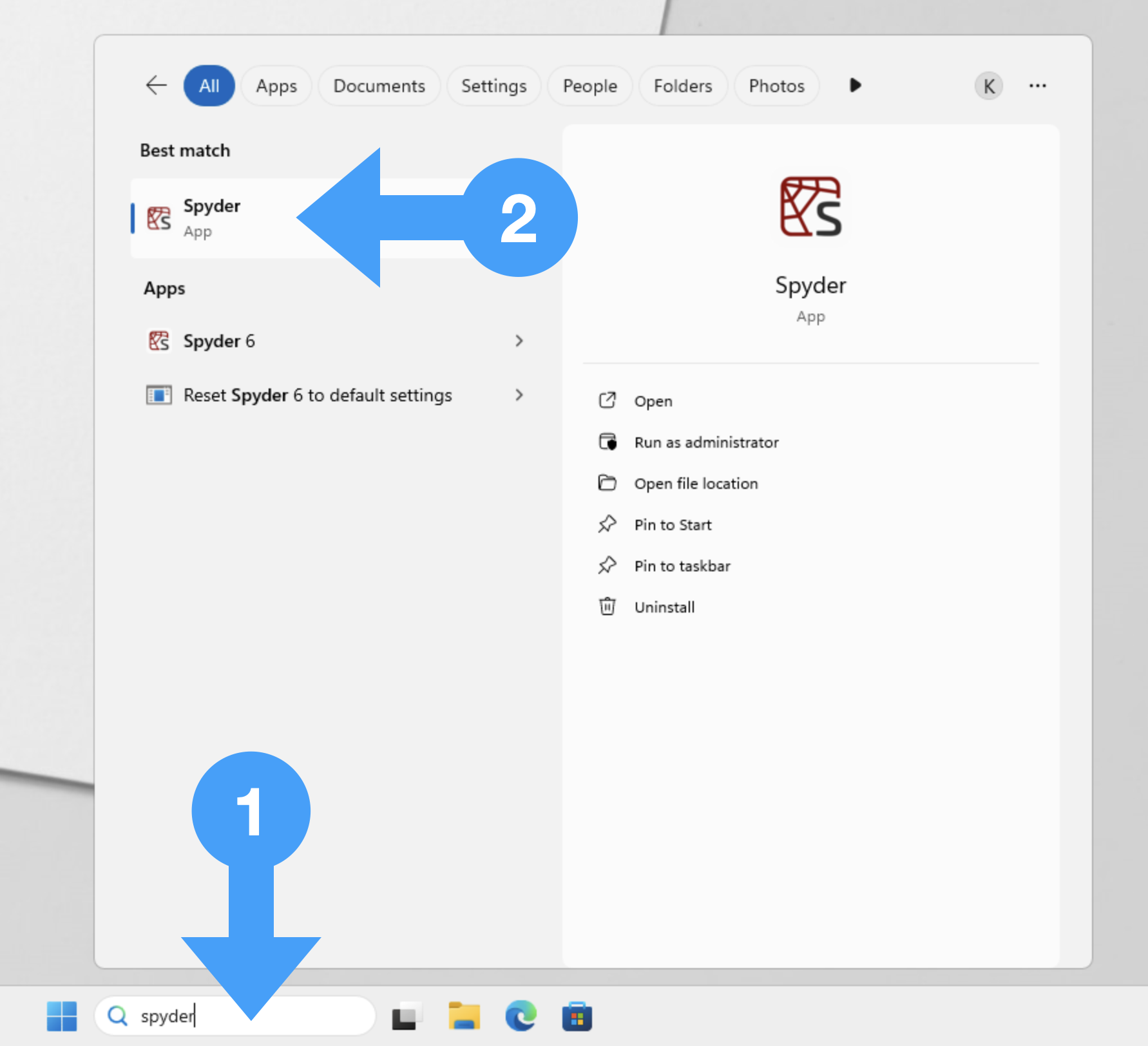 Sök efter Spyder i aktivitetsfältet (1) och klicka på Spynder (2).