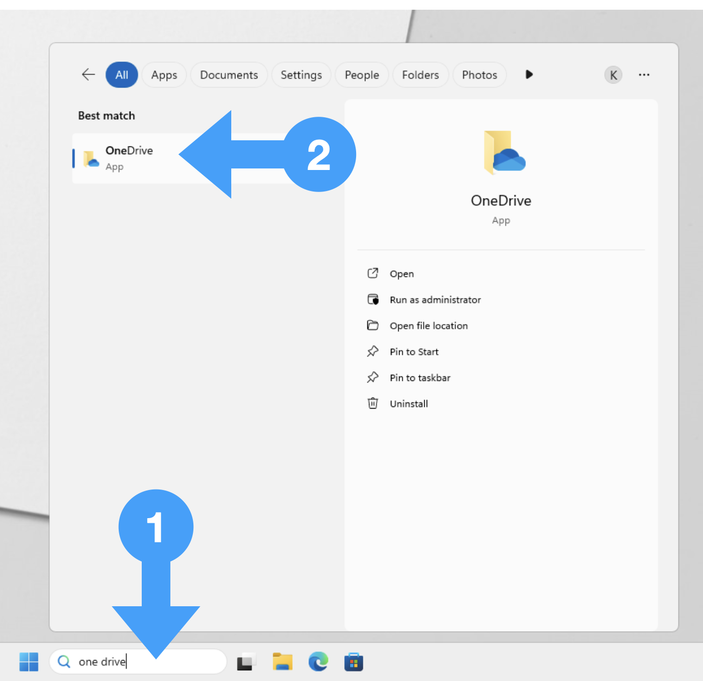 Om du inte hittar OneDrive i utforskaren, sök efter One Drive i taskbar (1) och klicka på OneDrive App (2).